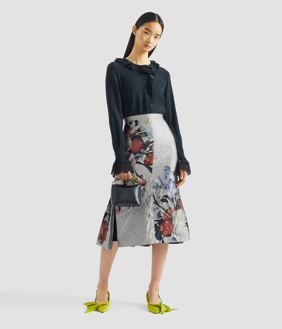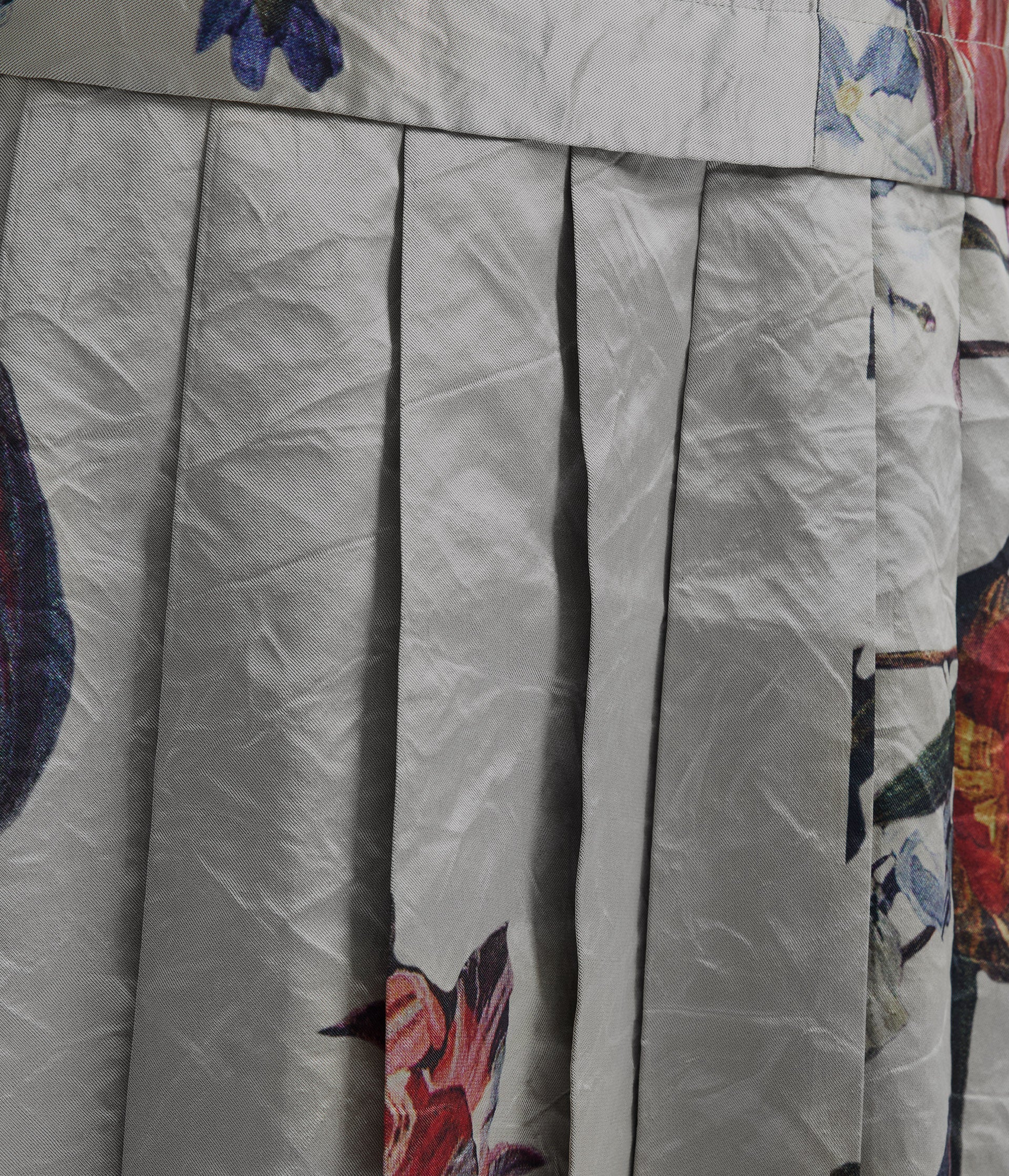 Made from textured satin, this dove grey skirt features the season’s Dutch-inspired floral print. It is pleated at the back to add a sense of volume and movement.