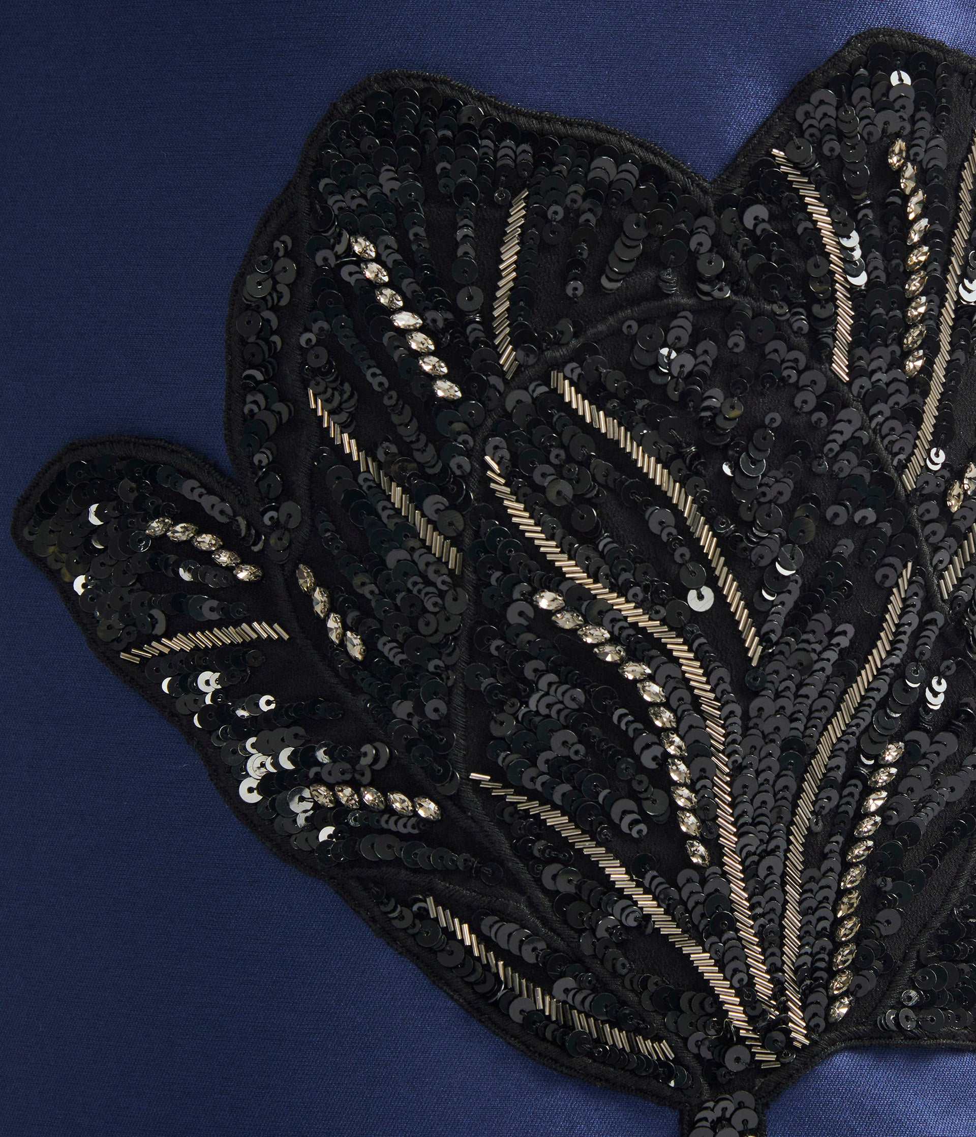 This pencil skirt is cut from midnight mikado, a twill fabric which has been yarn dyed for its depth of colour. It features an oversized tulip appliqué with sequin and crystal embroidery.