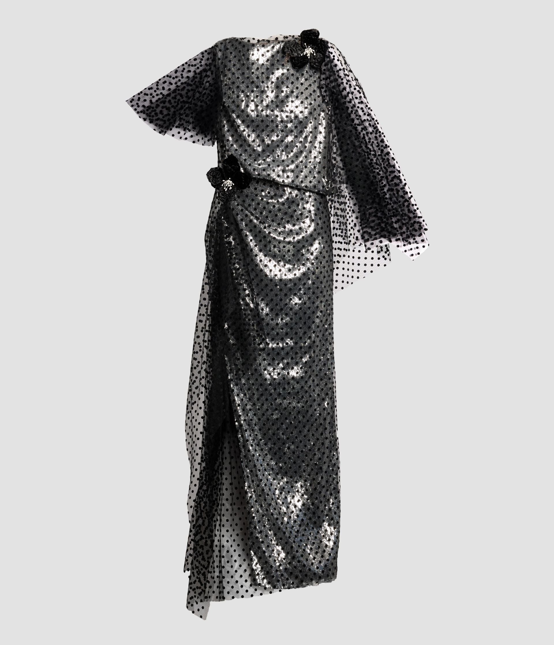 Main: 66% Nylon, 34% Viscose. Secondary: 100% Polyester, Sequin: 100% Pet. Lining:100% Silk.