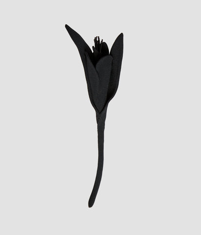 The tulip is one of Creative Director Erdem Moralıoglu, recurring motifs, and it is seen throughout the Pre Spring Summer 2026 collection in myriad forms. Here it is imagined as a three-dimensional brooch, crafted from black matte satin cady.