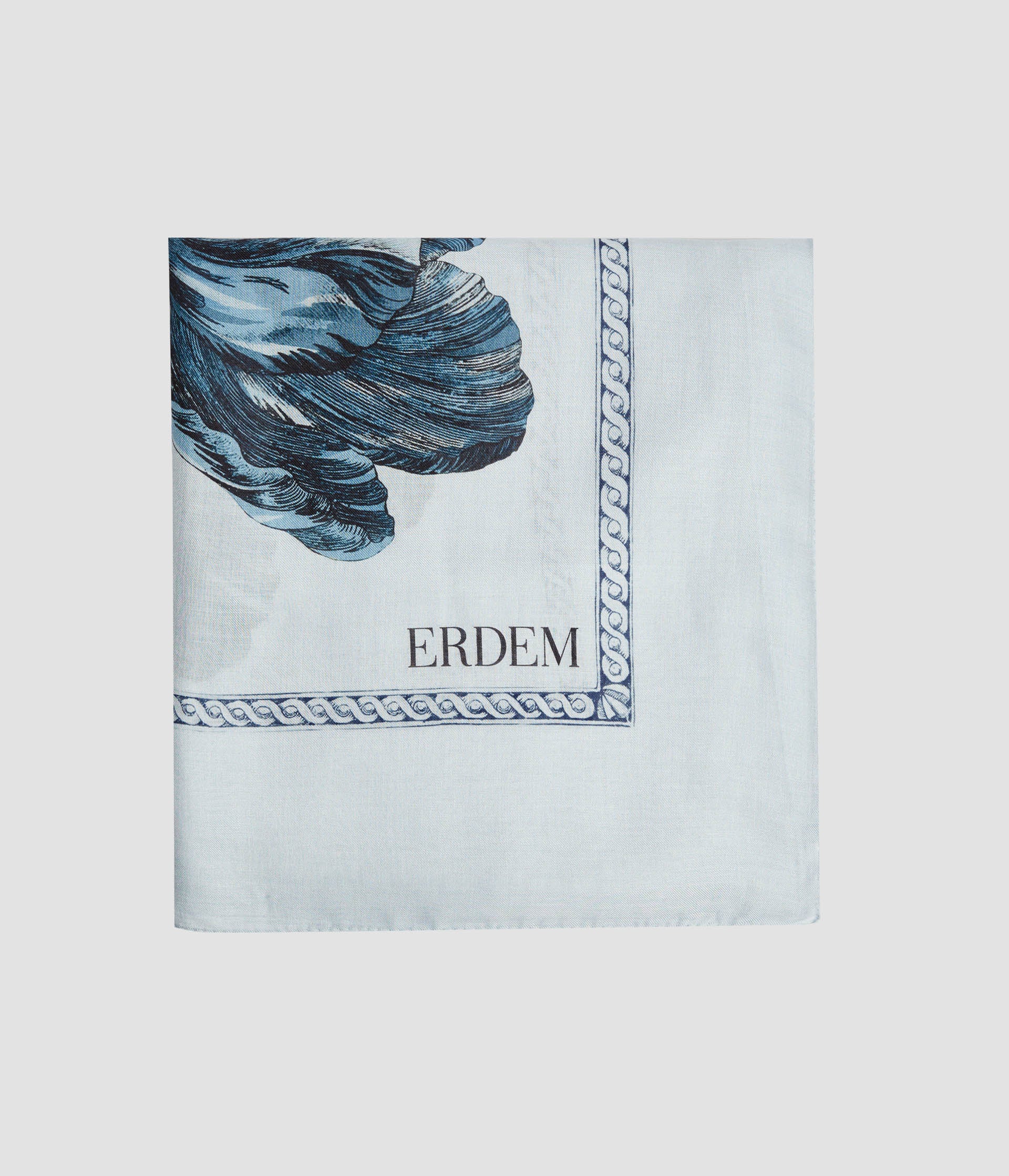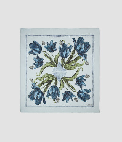 Made from a lightweight blend of modal and silk, this blue scarf is decorated with tonal tulips and butterflies inspired by drawings by the German naturalist Maria Sibylla Merian.