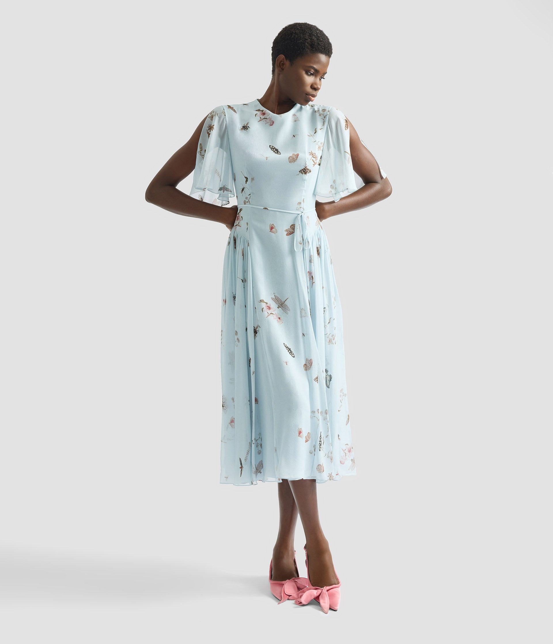 Made from lightweight silk voile, this powder blue dress is gathered at the hips to create volume in the skirt. The print, inspired by the curious mind of German naturalist Maria Sibylla Merian, features a playful scattering of butterflies, bugs and small flowers.