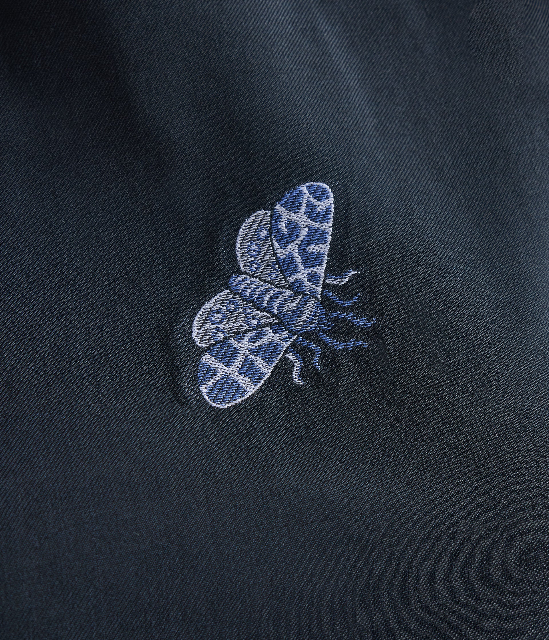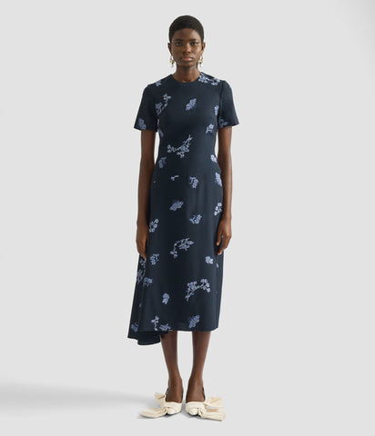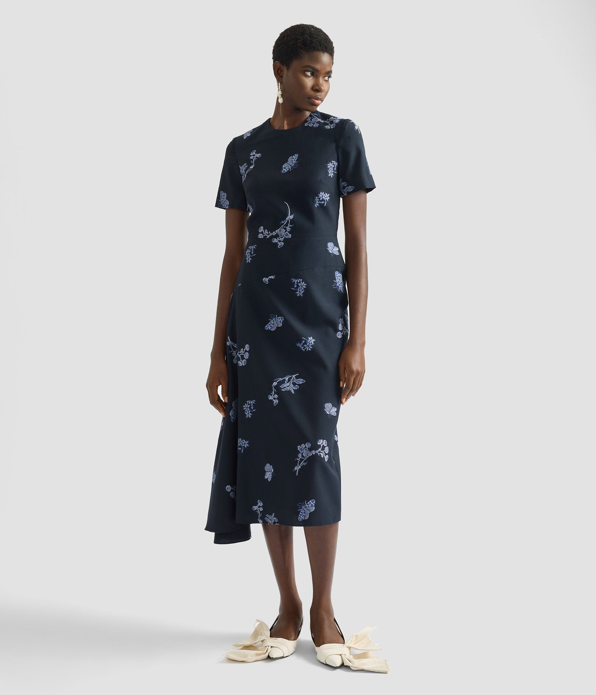 Tailored from midnight jacquard, this dress is woven with trailing florals and insect motifs inspired by the season’s muse, Maria Sibylla Merian. It is fitted through the bodice and has an asymmetric, draped skirt.