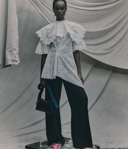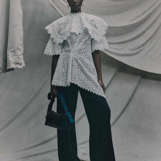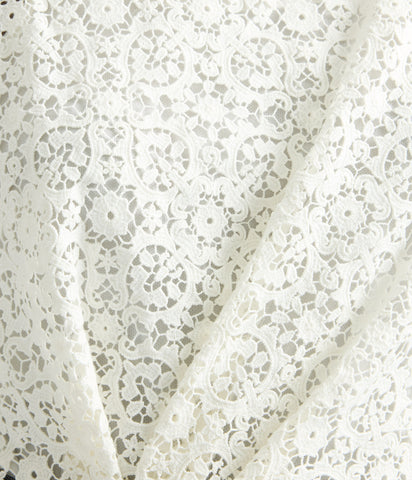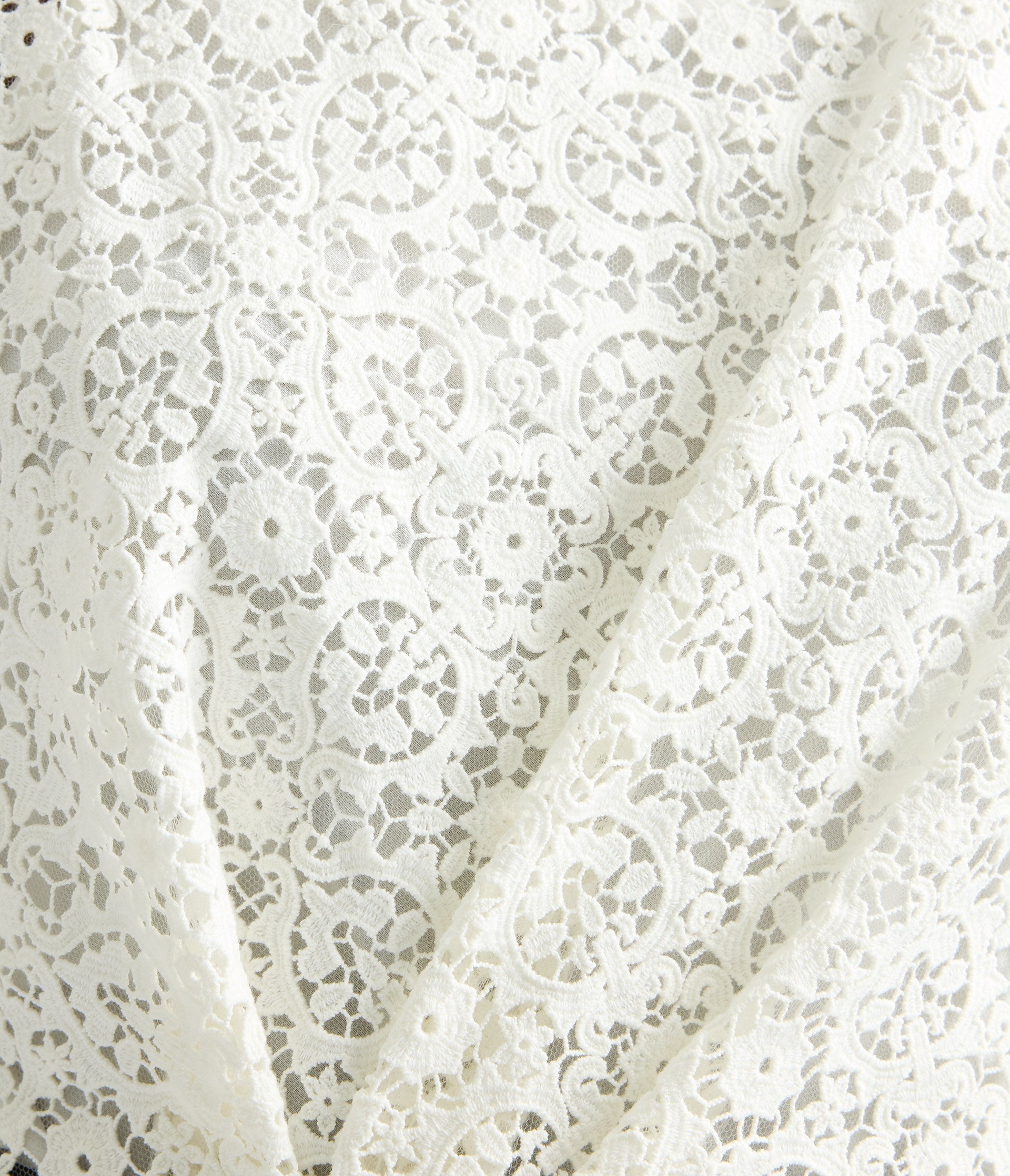 This top is made from cotton guipure which is inspired by 17th century lace. It is artfully folded and draped to create an asymmetric silhouette.