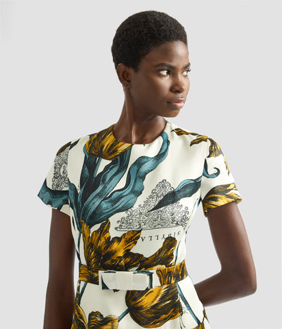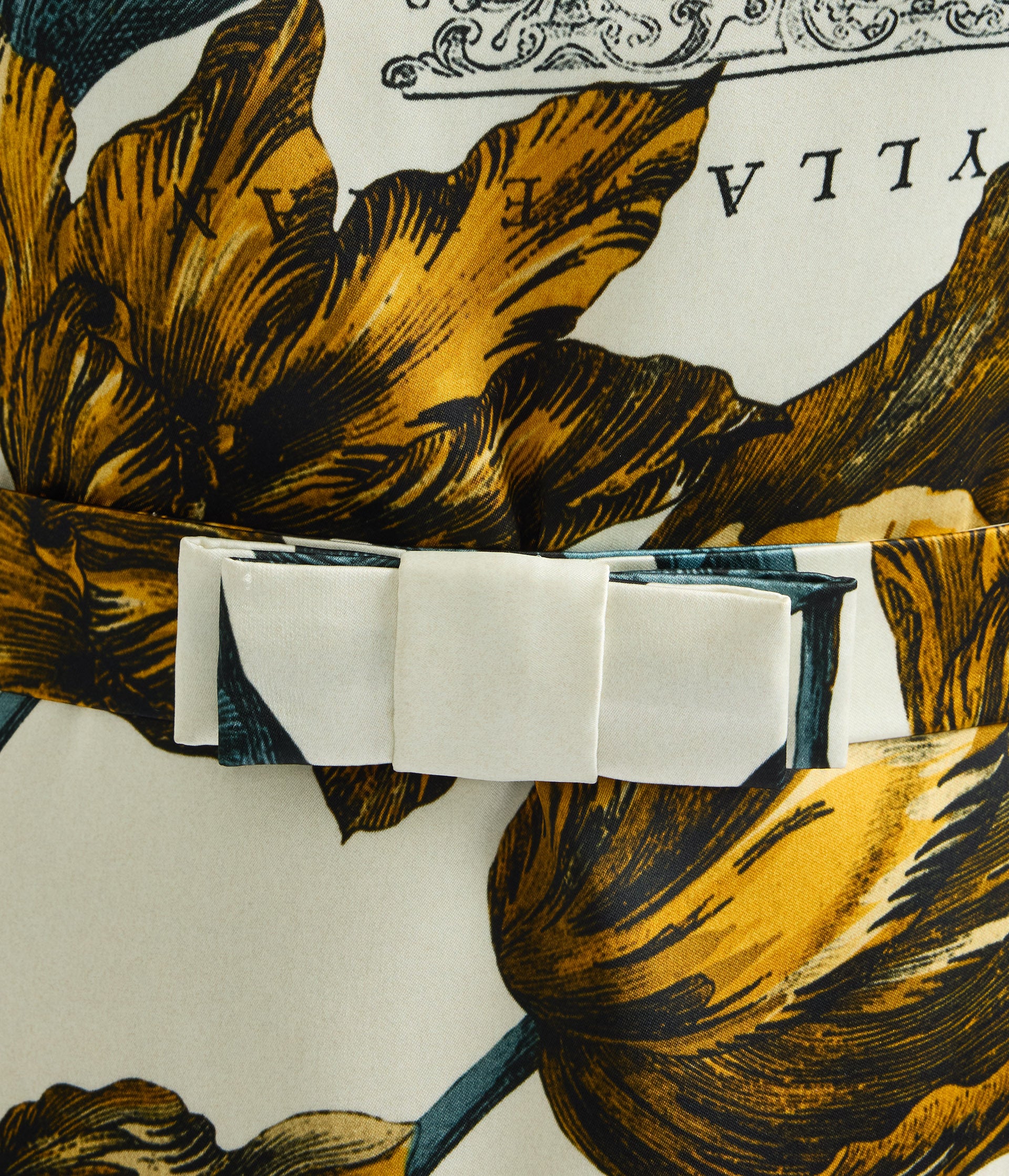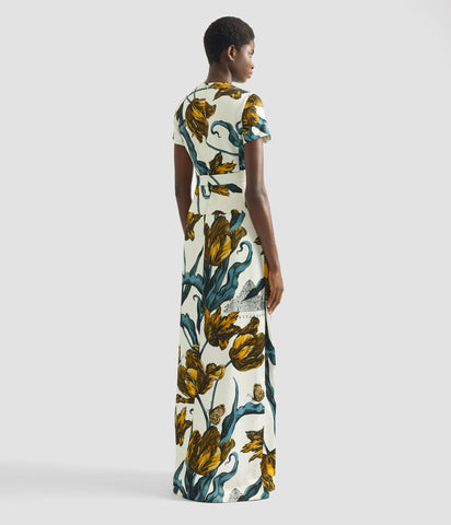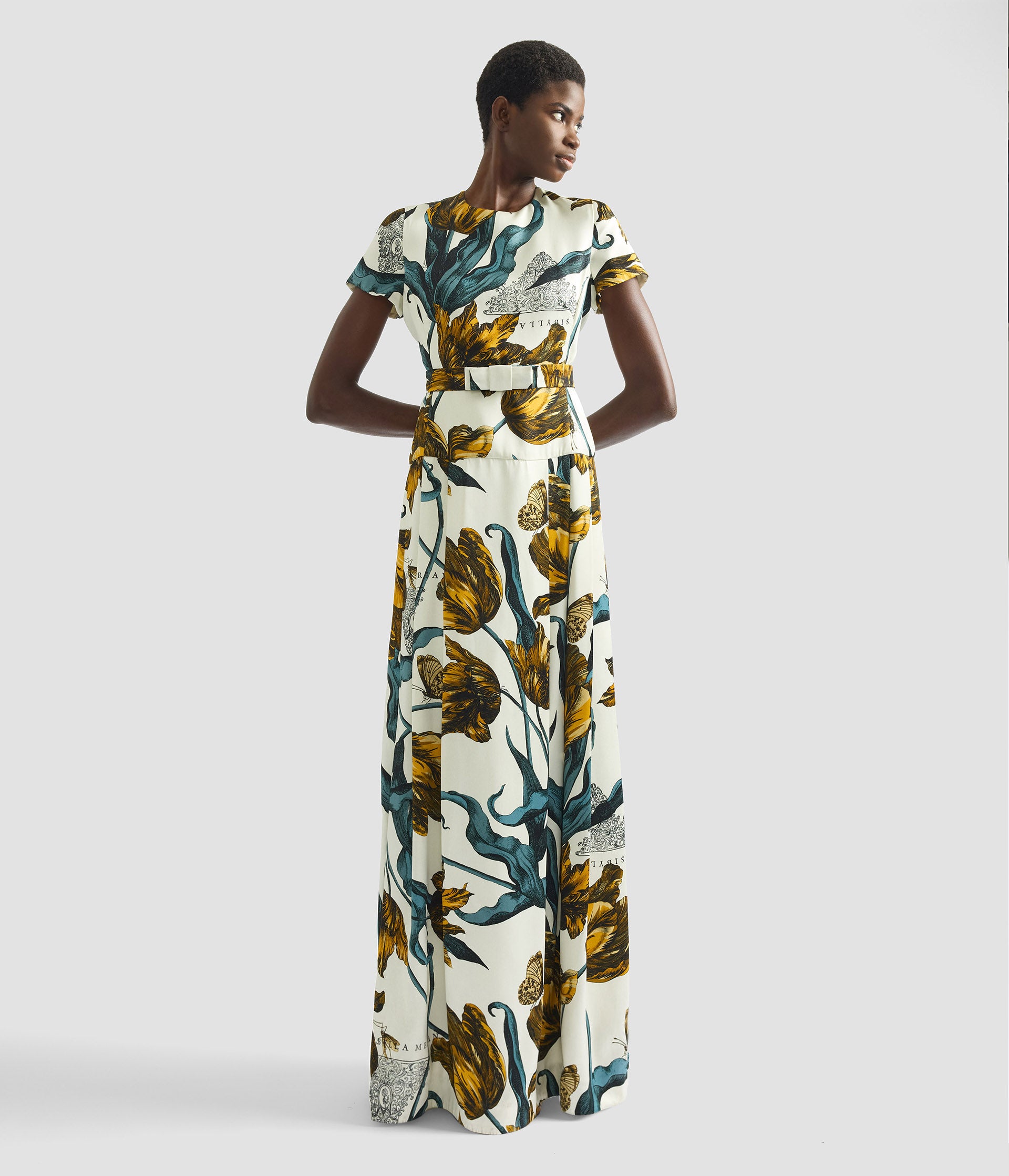 This gown is cut from midweight duchesse satin and falls to a floor-length, A-line skirt. The fabric is printed with bronze tulips inspired by traditional etchings by the German entomologist Maria Sibylla Merian.
