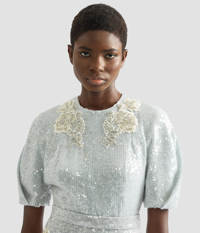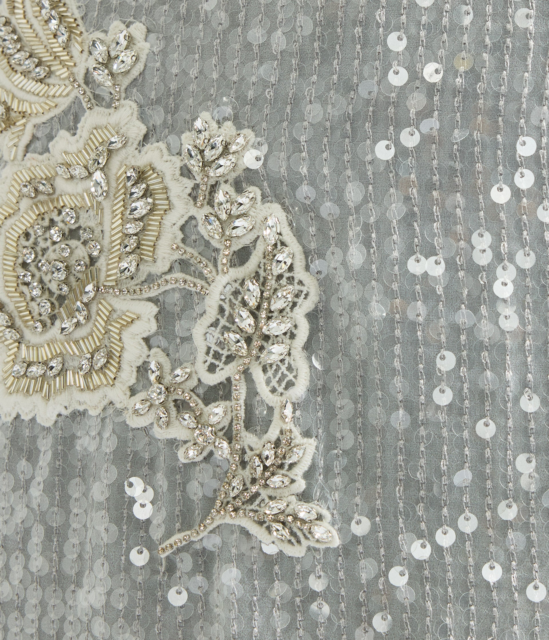 This cloud-grey cocktail dress is covered in scores of iridescent sequins, while floral guipure appliqués – which are hand-embellished with crystals and bugle beads – trace the neckline and hips.
