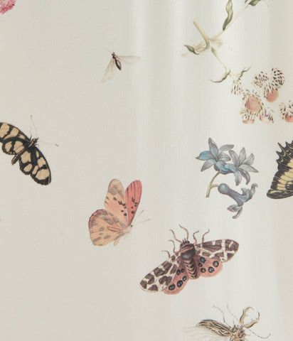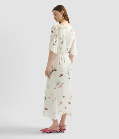 Cut from ivory crepe, this dress is draped at the neckline and falls to a gently fluted hem. The fabric is decorated with a scattering of butterflies, bugs and small flowers.