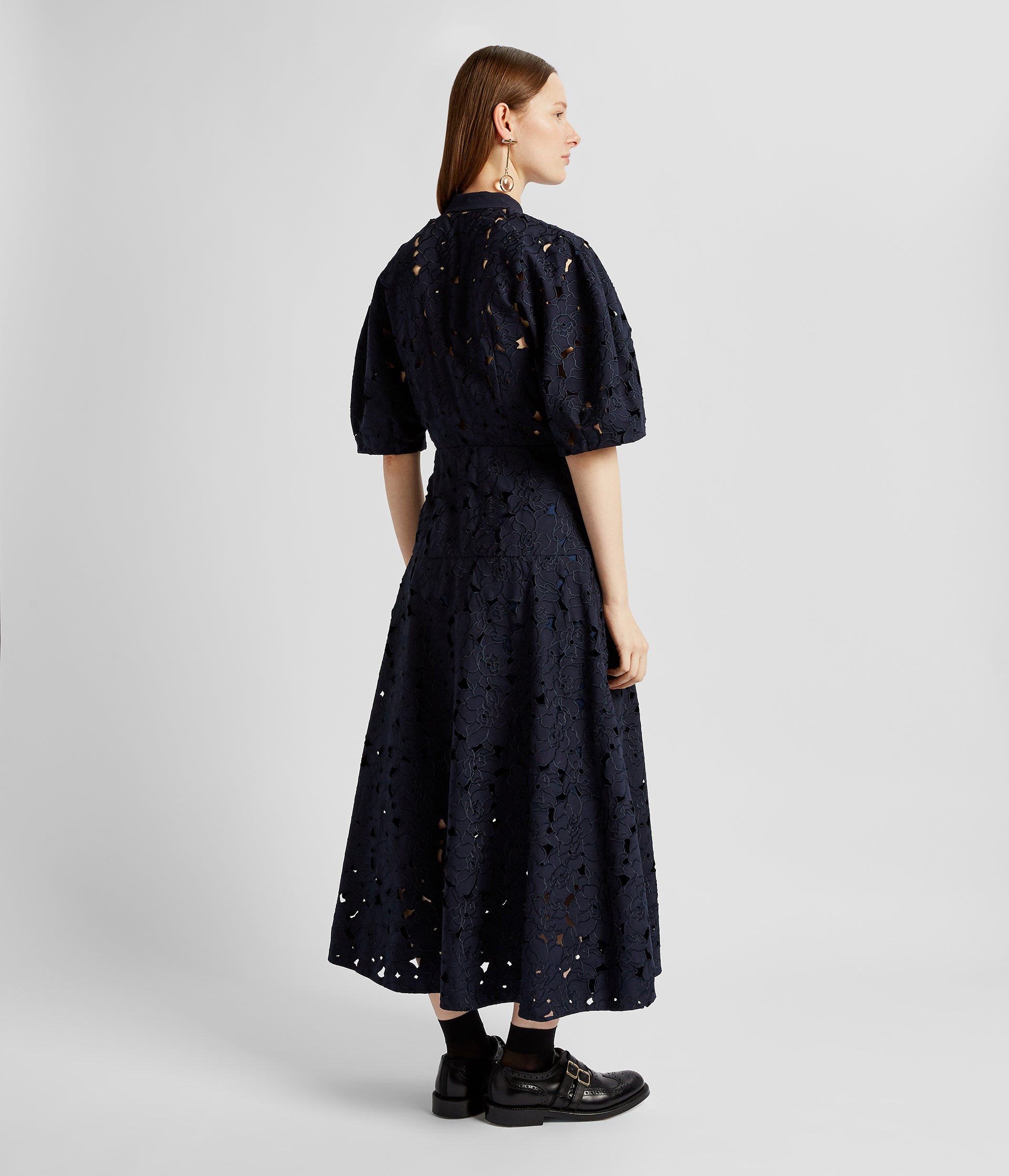 This navy shirt dress is crafted from our floral cutwork cotton, a reinterpretation of a traditional decorative cloth. It has a stand collar, puffed sleeves, and an A-line skirt.