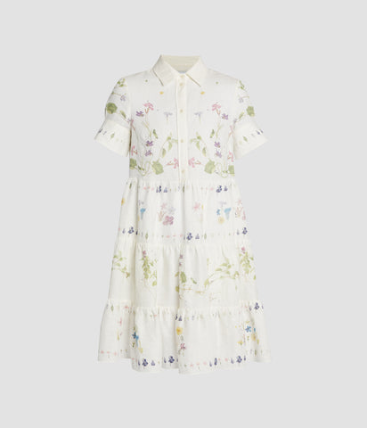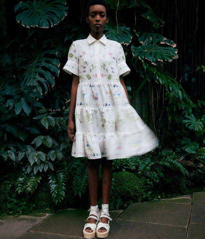 This lightweight white linen dress is decorated with a botanical garden print. Shaped for a relaxed fit, it has a point collar, tiered hem and short sleeves with deep cuffs.