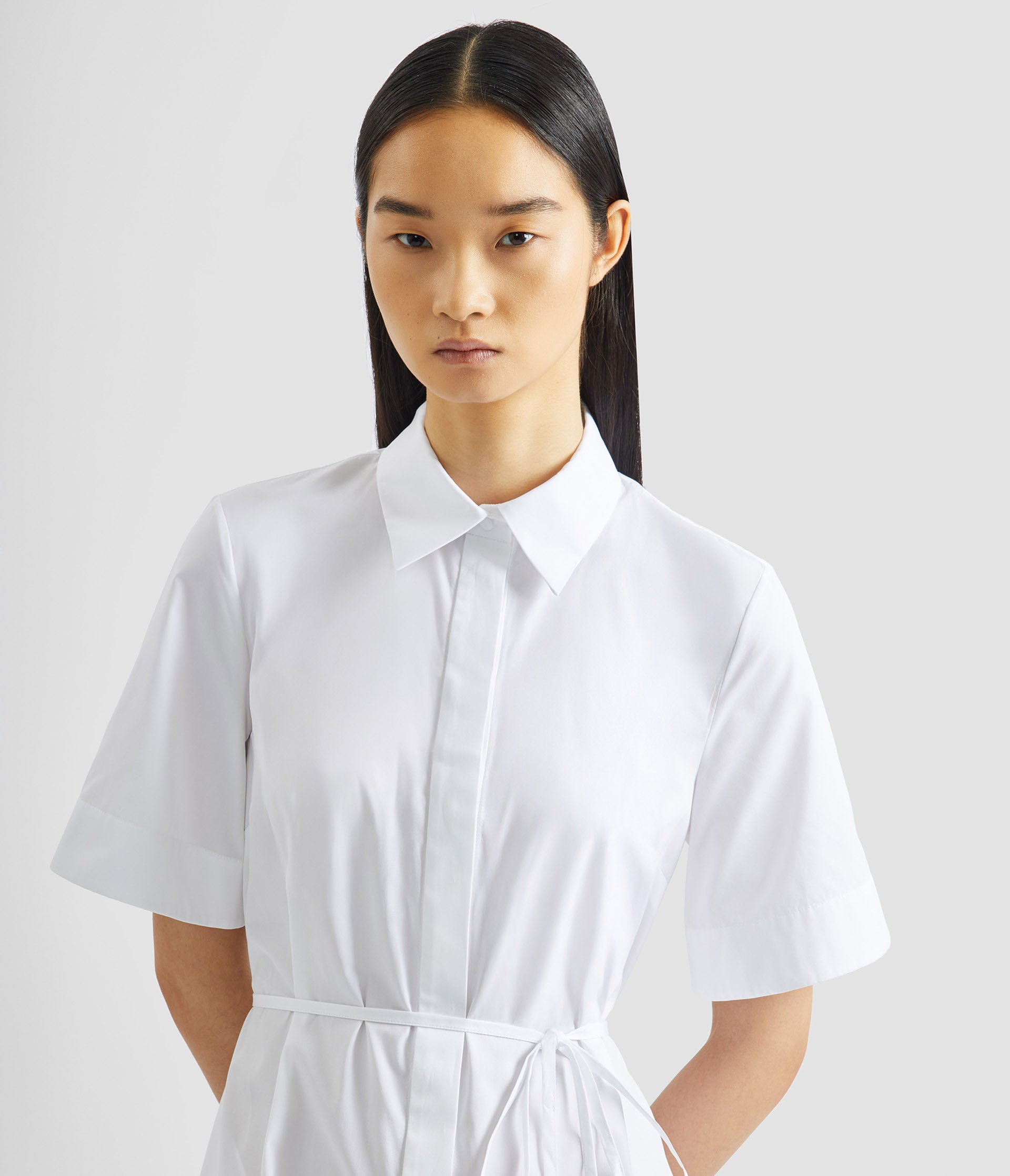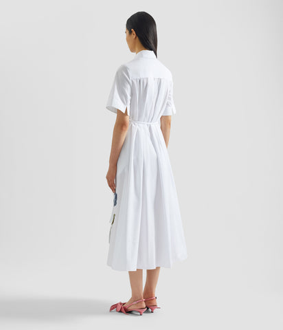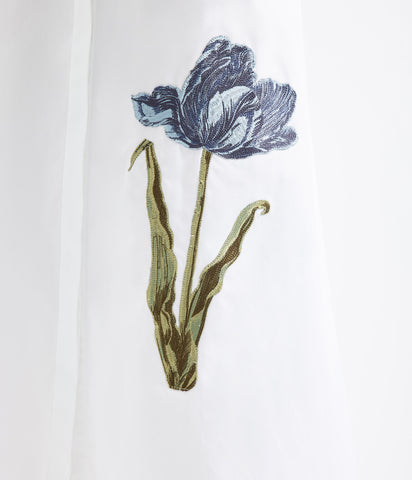Inspired by traditional men’s shirting, this white cotton poplin dress is cut for a relaxed, feminine silhouette. It is detailed with a blue floral embroidered appliqué.