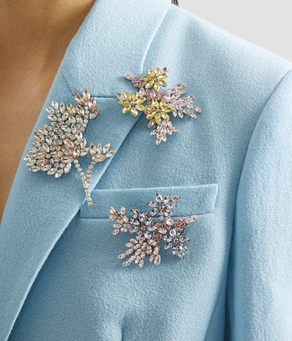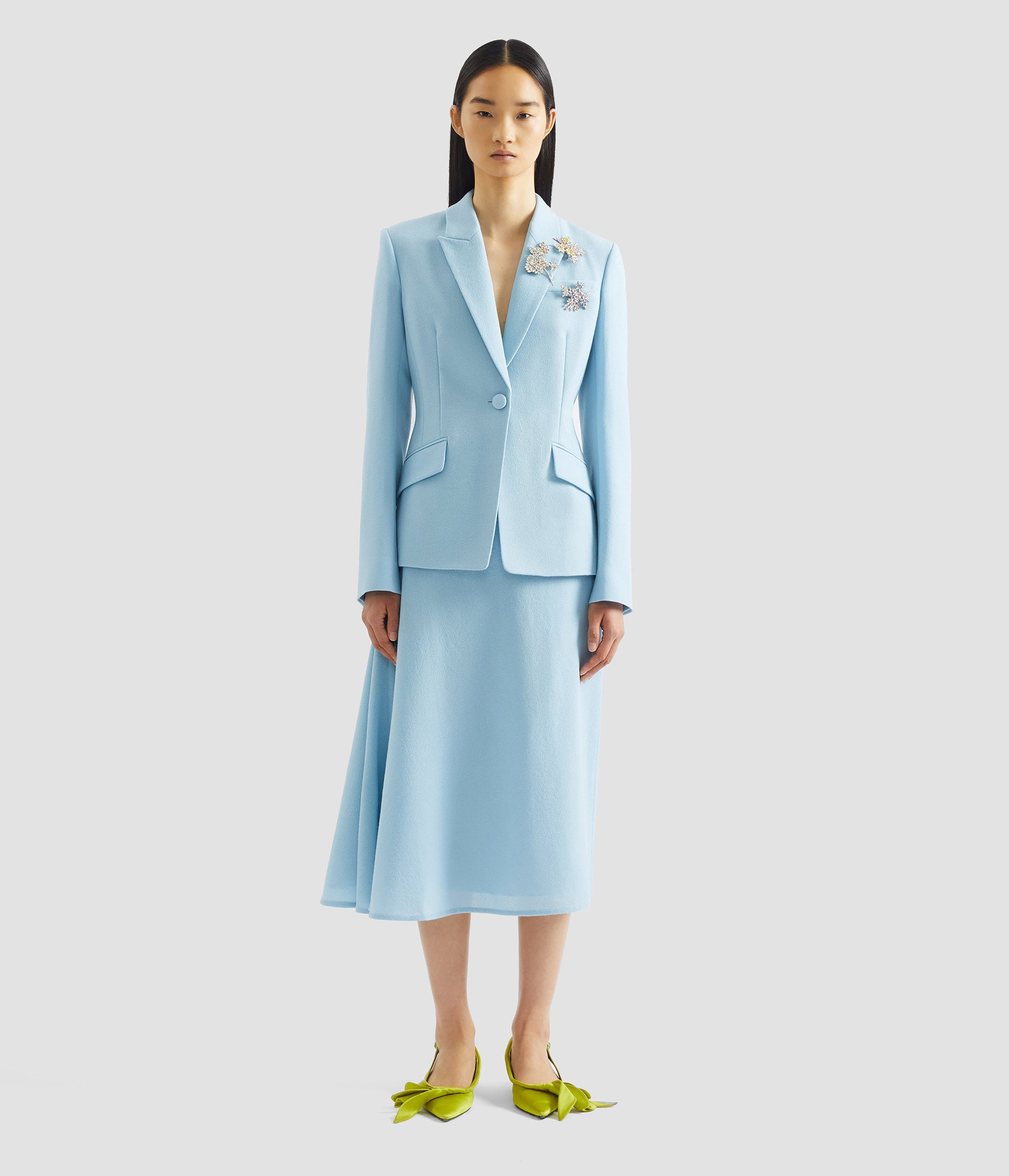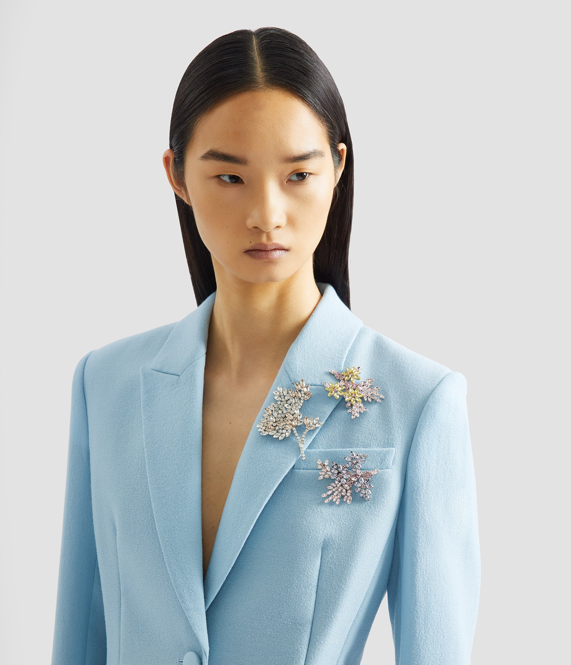 This structured blazer is cut from porcelain blue wool crepe. It is embellished with three colourful crystal flower brooches inspired by 18th century botanical illustrations.