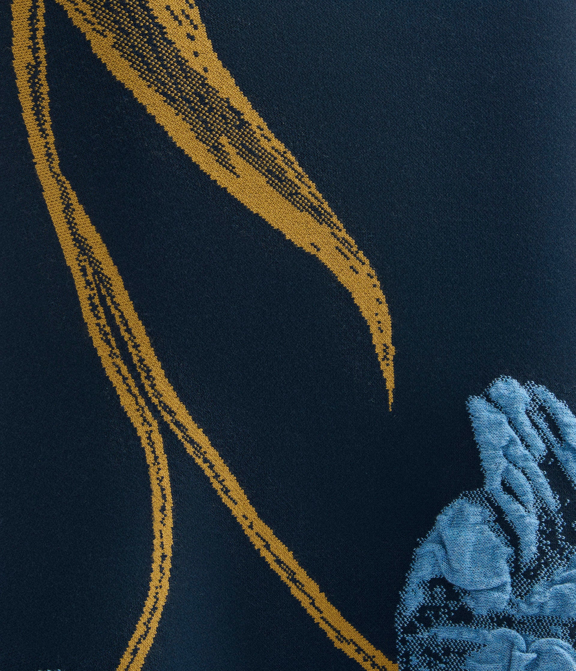 Shaping a close fit through the bodice and hips, this navy knitted dress flares to a dramatic hem. It is detailed with two oversized blue tulips, each woven in three-dimensional tubular cotton to create a sense of depth and texture.