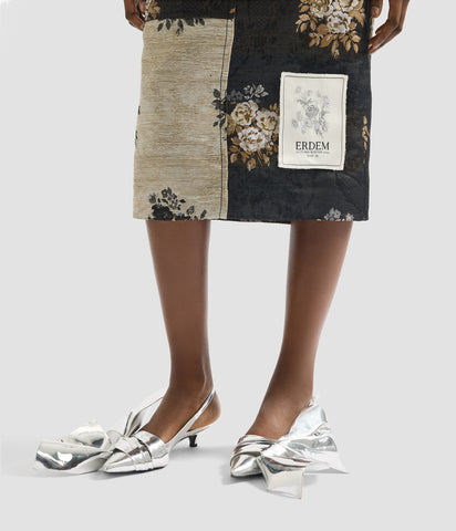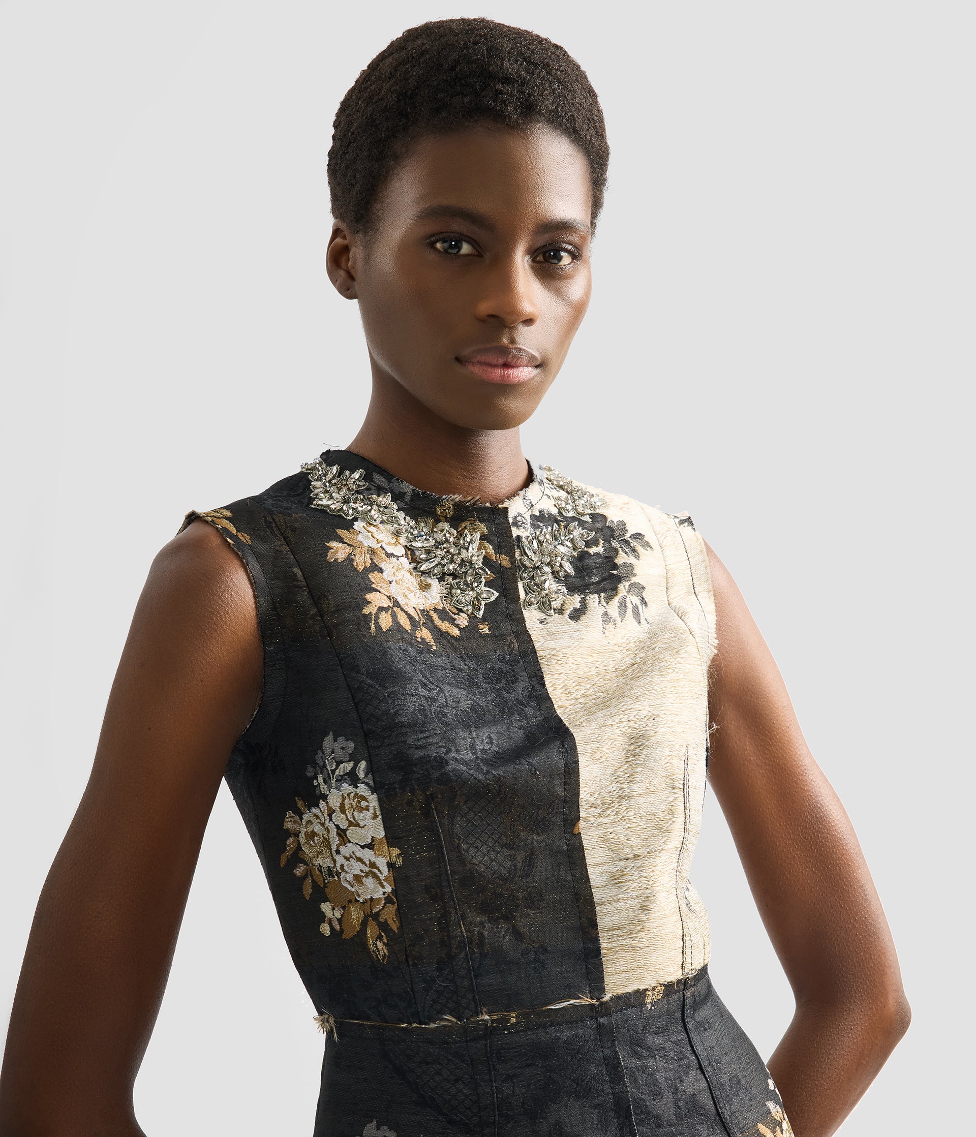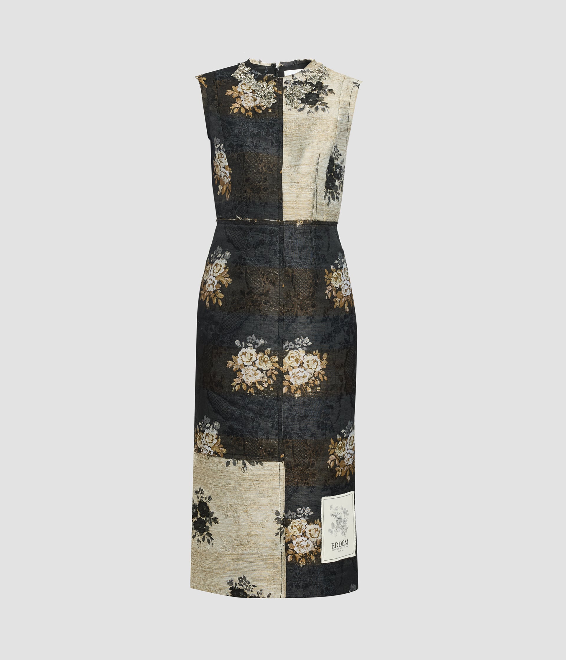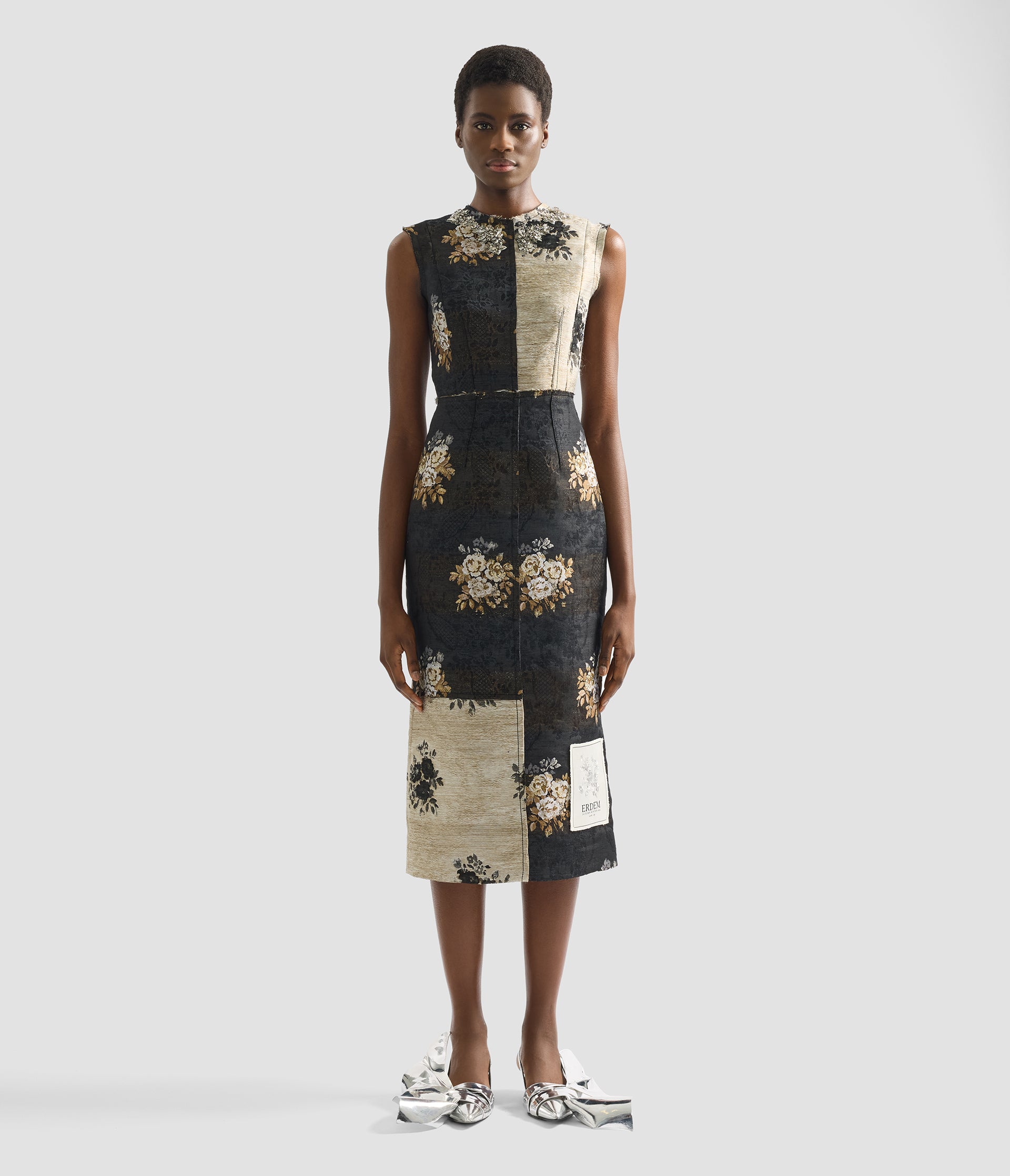 This pencil dress is crafted from three archived floral jacquards to create a spliced effect. Hand applied crystals and pearls trace the neckline, while a label sits at the hem. It forms part of ERDEM’s 20th anniversary celebration collection.