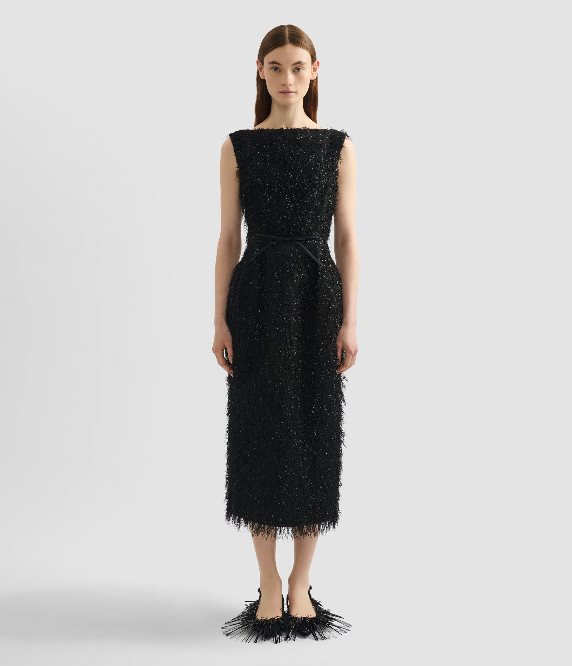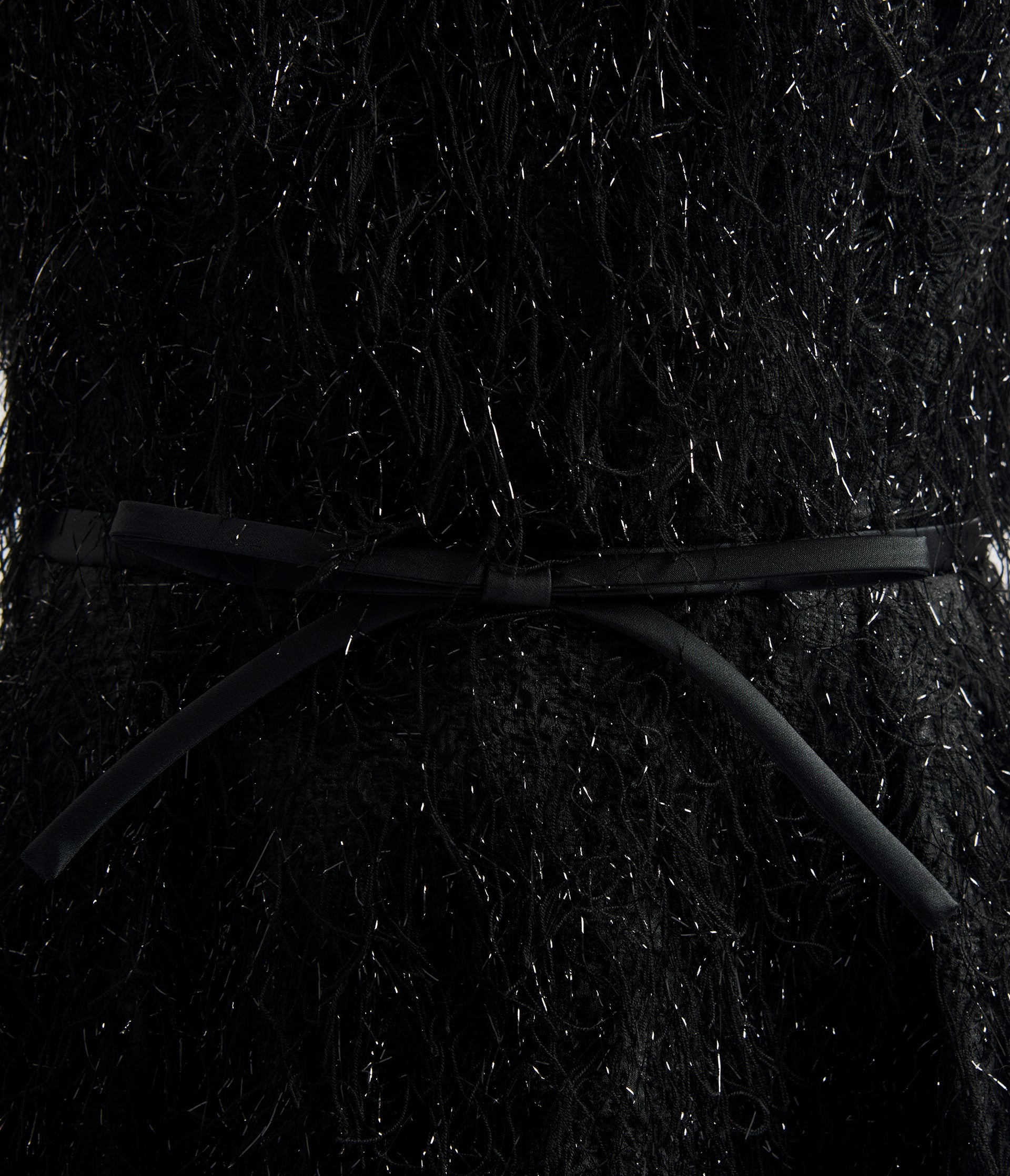 This black dress is crafted from black lurex fil coupé for soft yet striking texture. A bow-detailed belt complements the tulip-shaped skirt.