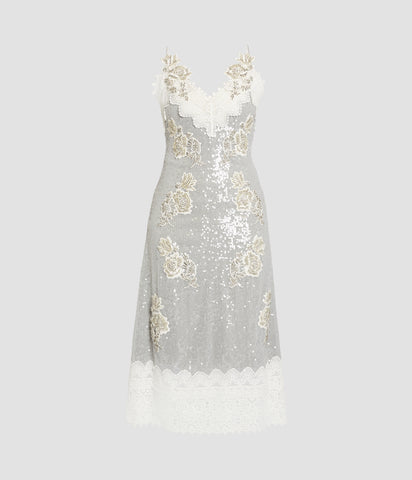 Look 5: Slip dress in cloud sequin with embroidered ivory guipure applique.