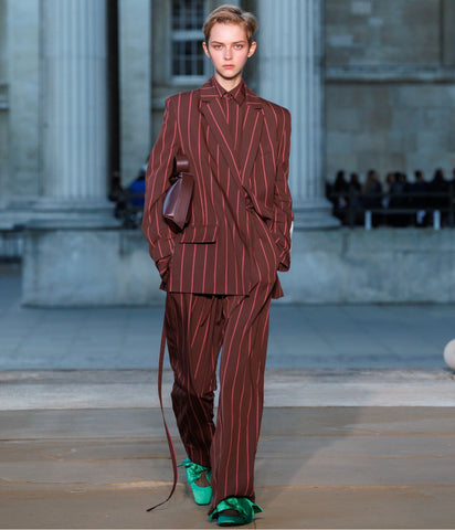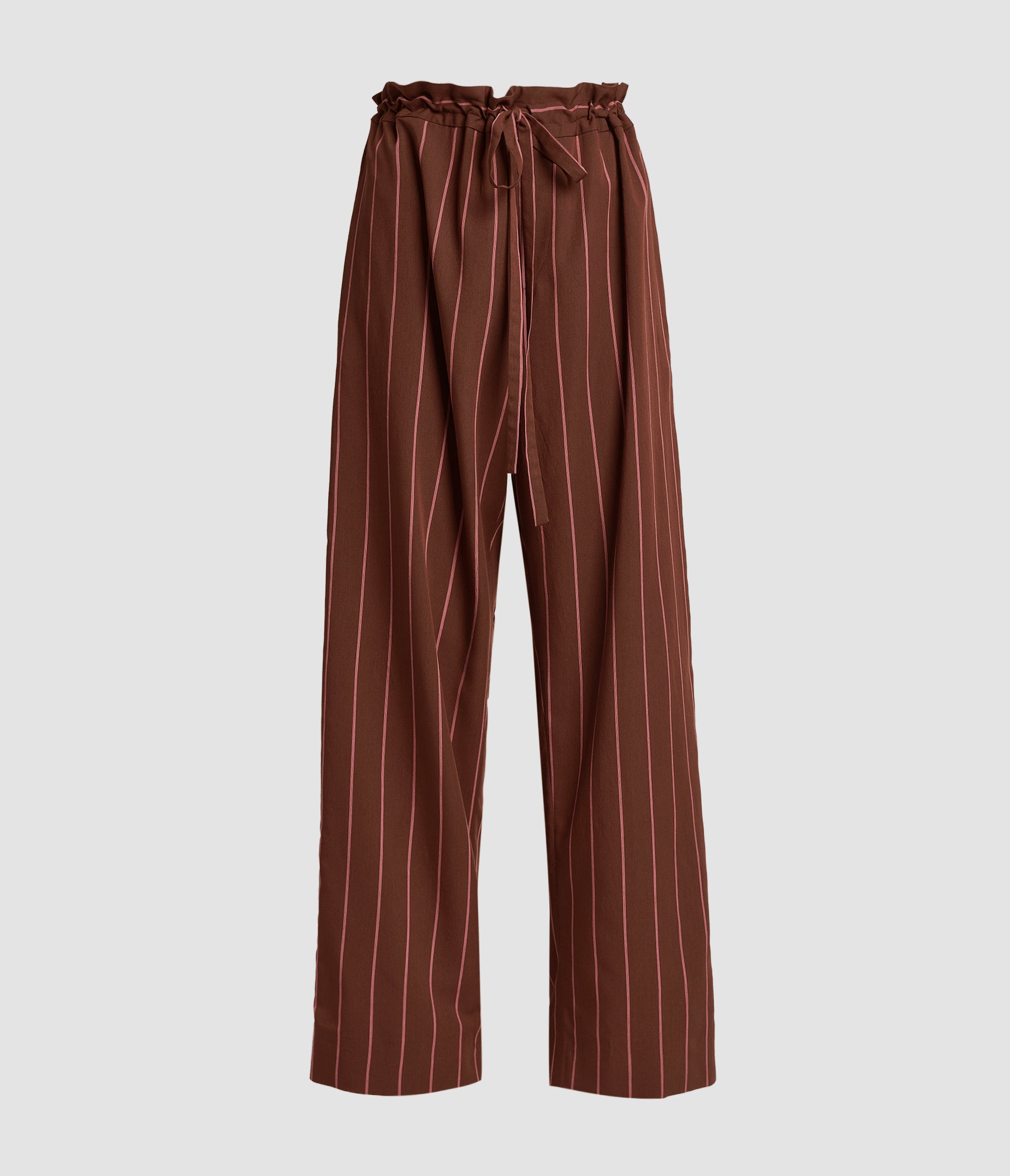 Look 23: Fluid blazer worn with matching shirt and drawstring trousers in soft brown striped cotton.