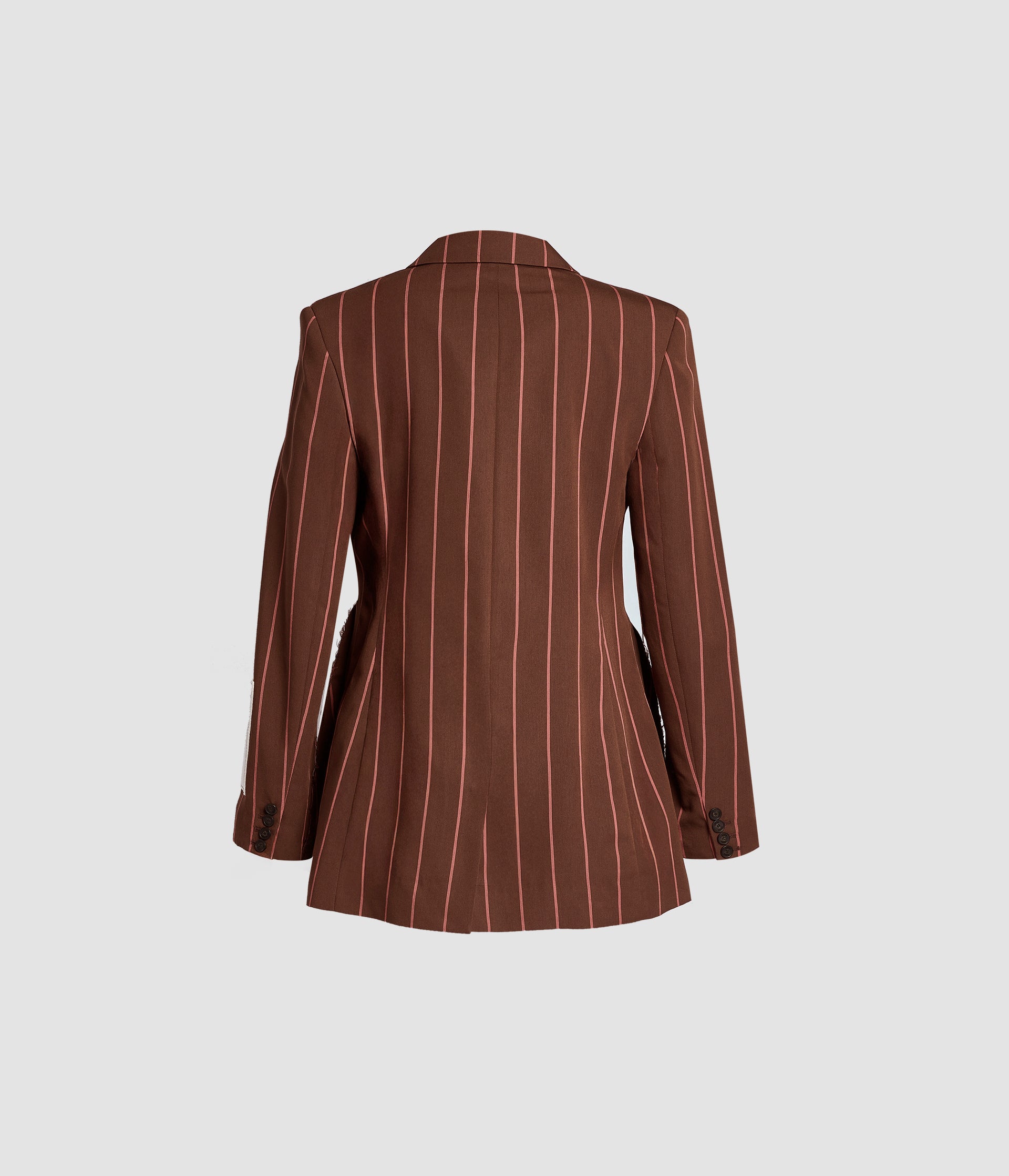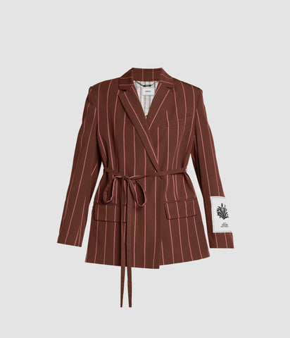 Look 23: Fluid blazer worn with matching shirt and drawstring trousers in ochre striped cotton.