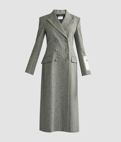 This double-breasted coat is made from brushed flannel tailoring. The pinstripes are created using a textural wool that blends into the background for a degrade effect.